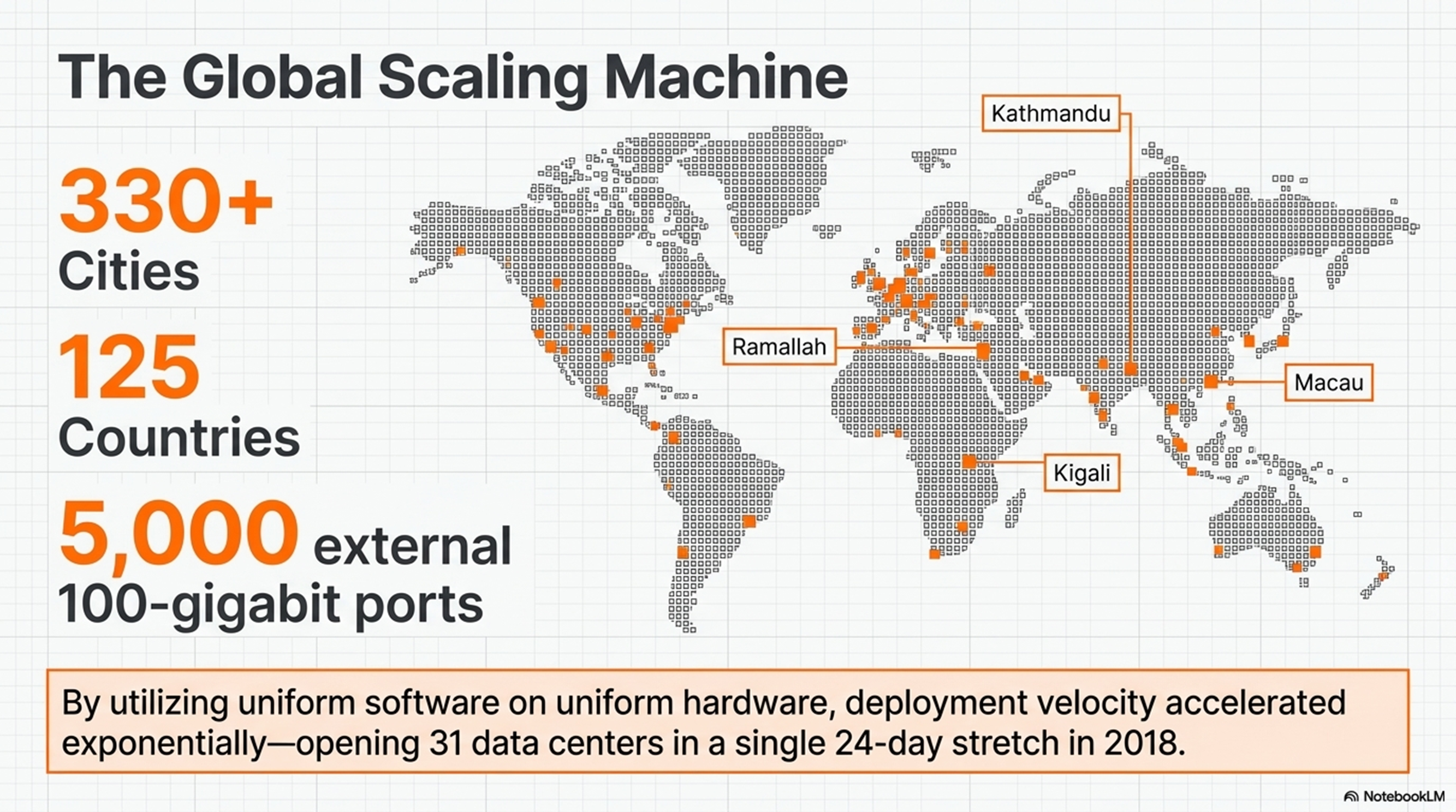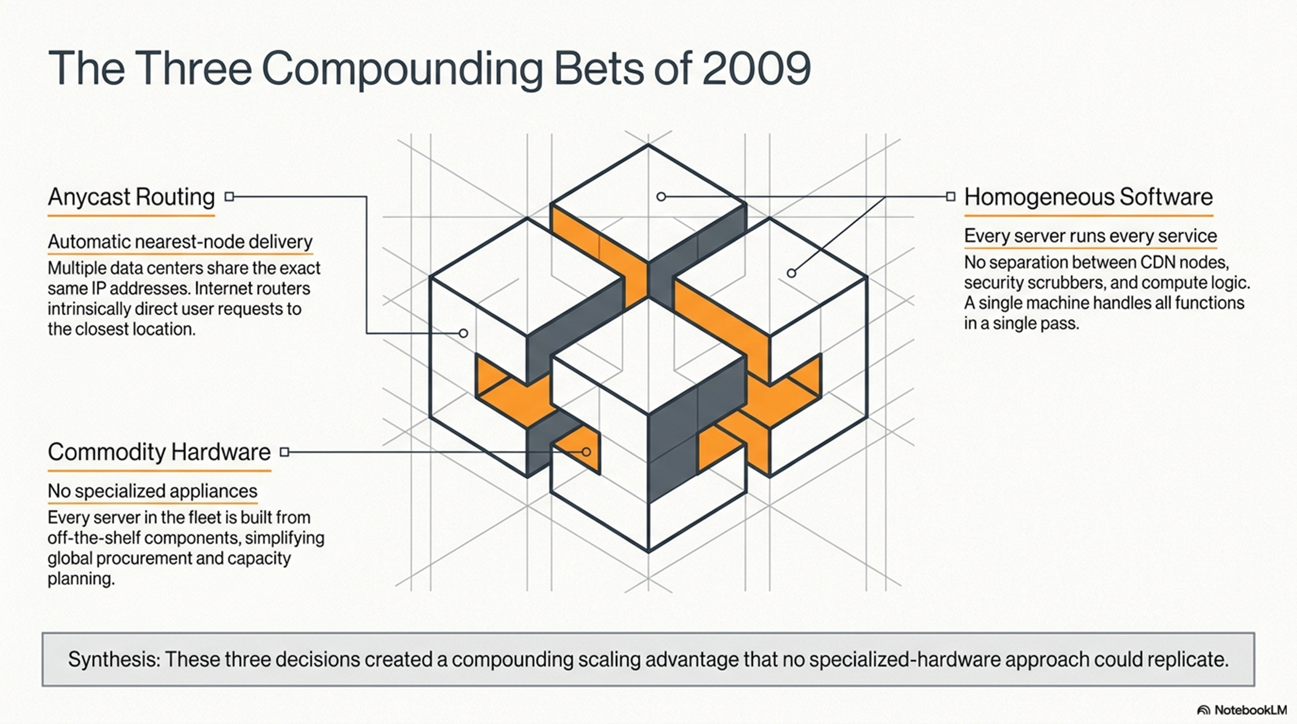 These three choices — commodity hardware, anycast routing, and a homogeneous software stack — created compounding returns that no specialized-hardware approach could replicate. The chapters that follow trace exactly how that compounding played out.