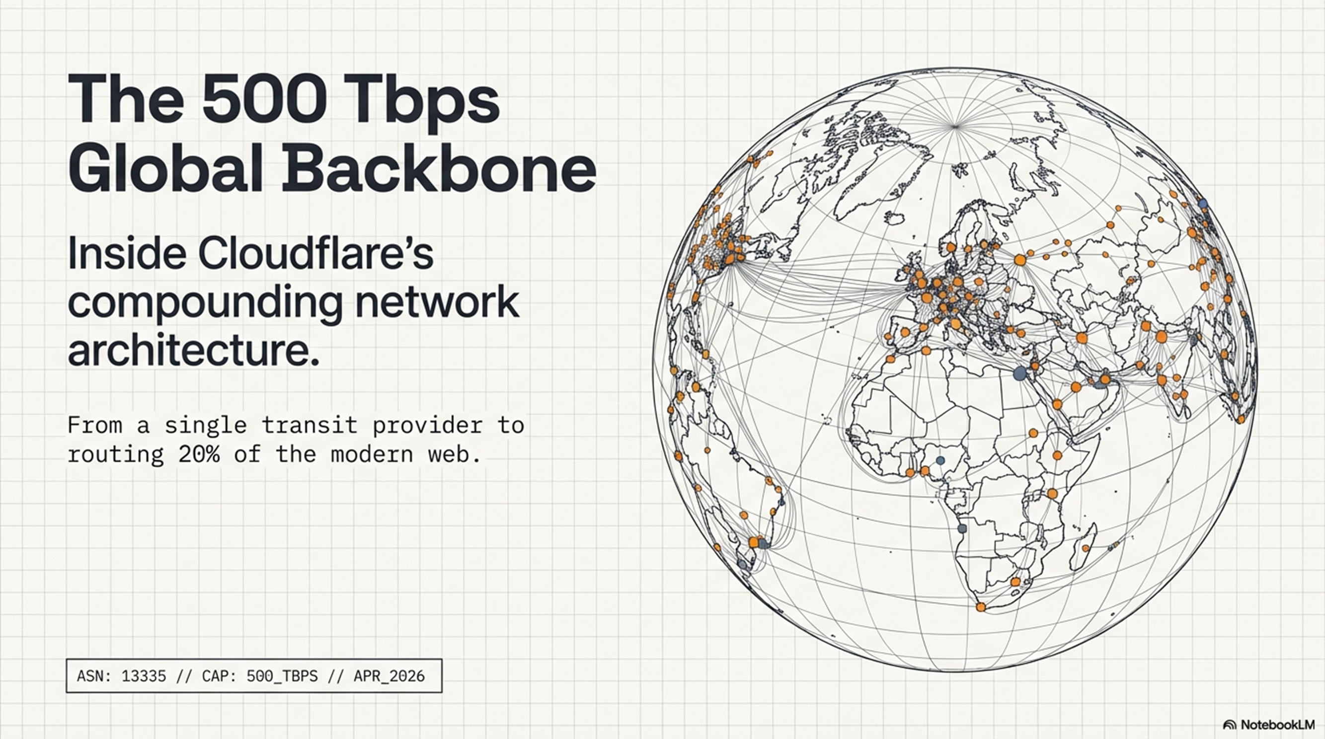 In April 2026, Cloudflare crossed five hundred terabits per second of provisioned network capacity — enough to carry more than twenty percent of all web traffic across three hundred and thirty cities in a hundred and twenty-five countries. Sixteen years earlier, the company did not exist.